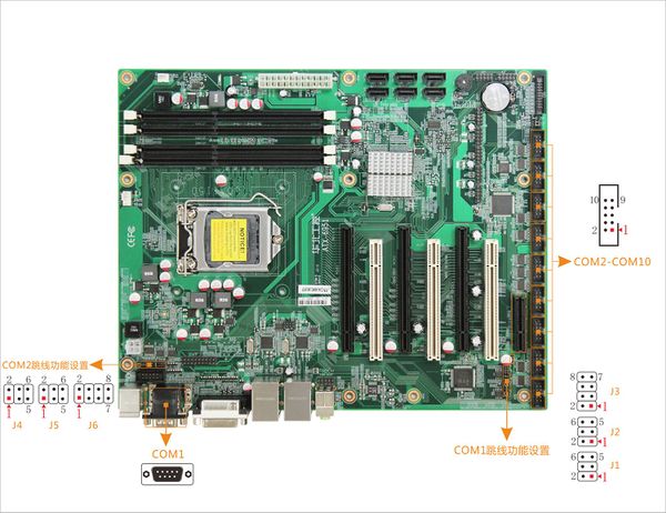 - COM1,COM2 跳线功能设置(J1,J2,J3,J4,J5,J6):